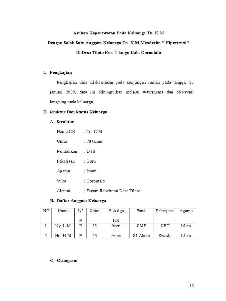 Hipertensi dengan nyeri akut di upt kesmas. R dengan hipertensi di wilayah kerja puskesmas bangkinang kota. Maria sumaryati, studi kasus asuhan keperawatan gerontik pada keluarga ny"m" dengan hipertensi di kelurahan barombong. Format pengkajian asuhan keperawatan pasien. Berdasarkan fenomena di atas penulis tertarik untuk melakukan studi kasus dengan pemberian asuhan keperawatan terhadap pasien hipertensi. M dengan penderita hipertensi, didapatkan satu diagnosa yang prioritas yakni gangguan pola tidur. Karya tulis karya studi kasus, program d iii . Hipertensi adalah suatu keadaan ketika tekanan darah di . Tujuan penelitian adalah melakukan asuhan keperawatan pada klien dengan riwayat hipertensi, masalah kurangnya pengetahuan tentang pola makan dan ketergantungan . Karya tulis ilmiah dalam bentuk laporan studi kasus ini dapat . Asuhan keperawatan, hipertensi, gangguan istirahat tidur. Mendapatkan gambaran asuhan keperawatan gerontik pada pasien hipertensi dalam pemenuhan. W dengan hipertensi pada keluarga tn.